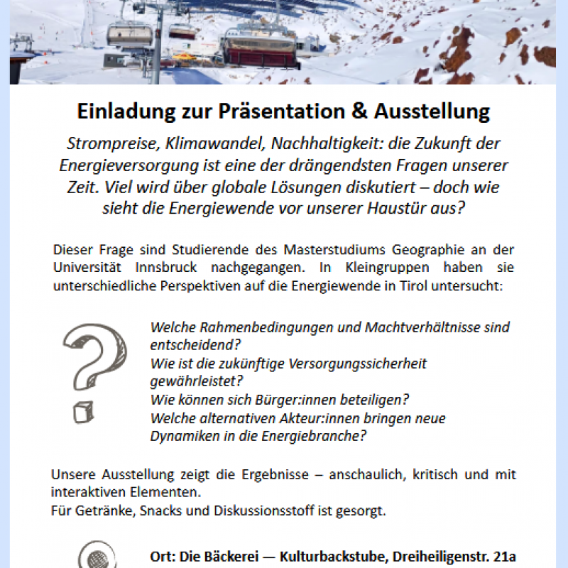 Zum Abschluss laden wir zur öffentlichen Präsentation der Projektergebnisse ein. In Form von Postern, Kurzvorträgen und interaktiven Elementen geben die Studierenden Einblicke in ihre Arbeiten und regen zur Diskussion über die Zukunft des Energiethemas in Tirol an.