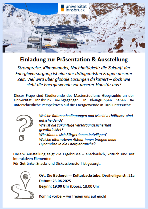 Studierende der Geographie an der Universität Innsbruck haben sich im Rahmen ihrer Master-Vertiefungsrichtung drei Semester lang intensiv mit diesen Fragen im Kontext sozial-ökologischer Transformation beschäftigt. Im Zentrum standen Themen wie der Ausbau und die Rolle der Wasserkraft, Akteur*innennetzwerke, Energiegemeinschaften, Fragen der Governance sowie die Reaktionen auf den Klimawandel und dessen Auswirkungen. Alle Themen wurden aus einer kritischen Perspektive beleuchtet.