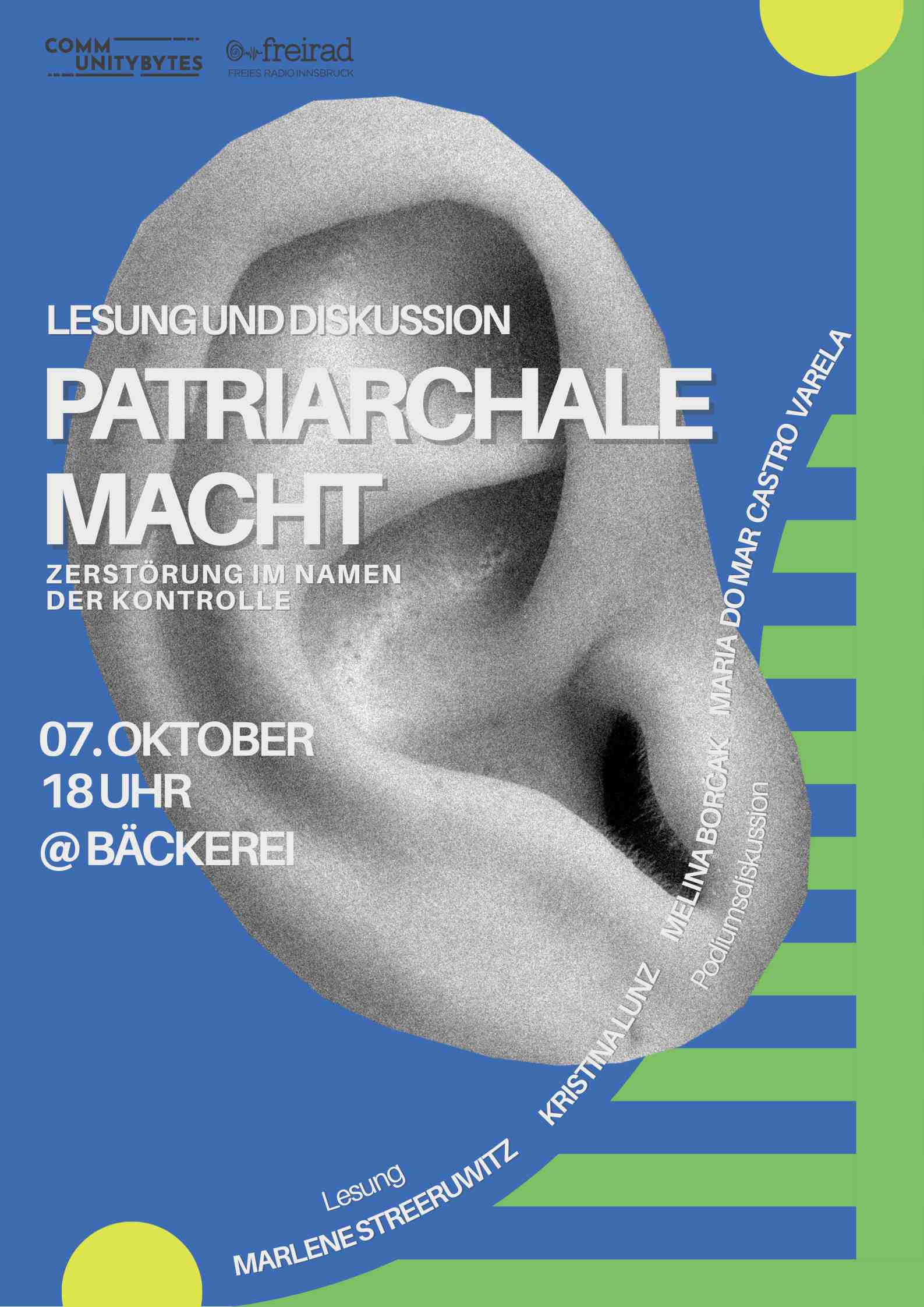 Das Freie Radio Innsbruck FREIRAD organisiert unter dem Titel “Patriarchale Macht: Zerstörung im Namen der Kontrolle” eine Veranstaltungsreihe. Wir erleben eine Welt und eine Zeit, in der Kriege, Gewalt und Zerstörung das Leben vieler Menschen beherrscht. Machthaber legitimieren ihre Angriffe und Zerstörung unter dem Deckmantel der Kontrolle und Sicherheit. Hinzu kommt die mediale Berichterstattung und die digitalisierte Welt beherrscht von Algorithmen, die inzwischen einen wesentlichen Einfluss auf Meinungsbildung haben.