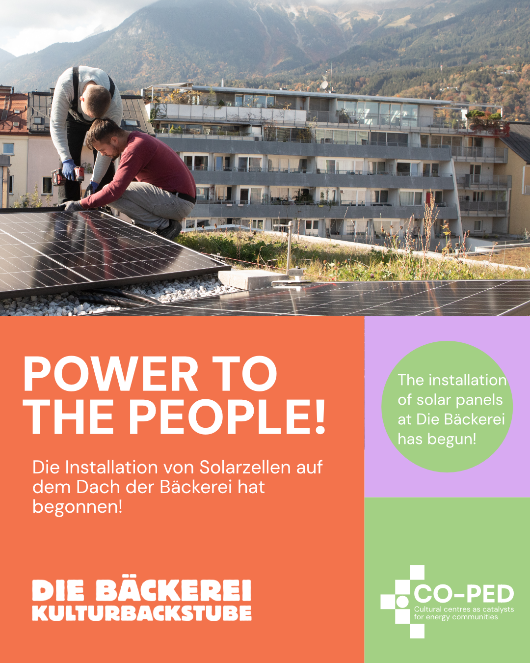 In Innsbruck, Die Bäckerei – Kulturbackstube is one of eight Urban Living Labs across Europe. Together with Gemeinwohlenergie, Innsbrucker Kommunalbetriebe (IKB), the City of Innsbruck, and local residents, we are building a community-driven energy cooperative. Our aim is to make the energy transition visible and tangible — not just through technology, but also through culture. With debates, workshops, storytelling and artistic formats, we bring people together to understand energy as something communal and creative.